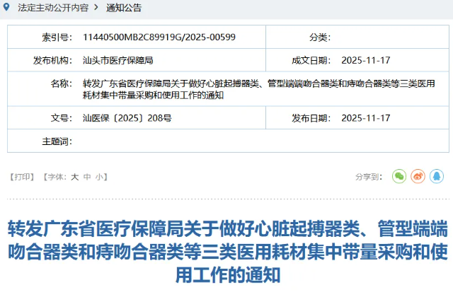 廣東省牽頭的心臟起搏器類、管型端端吻合器類、痔吻合器類高值耗材接續采購,即將于12月1日在多省落地,江西已提前于11月11日啟動。